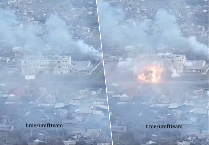De video toont een gebouw in de oostelijke stad Bachmoet. Even later volgt een zware explosie op de benedenverdieping van het pand, waarop een deel instort en een reusachtige rookpluim opstijgt.